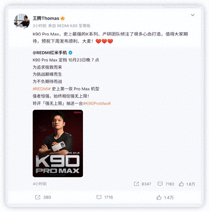 “K90 Pro Max,史上最强的K系列,产研团队真的花了不少心思,大家可以期待下!”10月17号这天,离开小米一个多月的王腾突然发了条微博,一下就把数码圈给炸热了 ——# 王腾宣传K90ProMax# 直接冲上热搜,之前传得沸沸扬扬的“他跟雷军闹掰”的说法,这下算是彻底没影儿了。