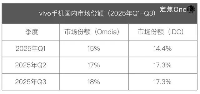 头部品牌的竞争格局尤为胶着,排名差异主要集中在二三位。IDC与Omdia均确认vivo以17.2%至18%的市场份额登顶,其优势源于“6·18”大促与暑期促销期间积累的销售动能,以及中低端产品线的精准升级,值得注意的是,vivo同时以17.2%的份额拿下2025年前三季度累计第一,显示出较强的市场韧性。
