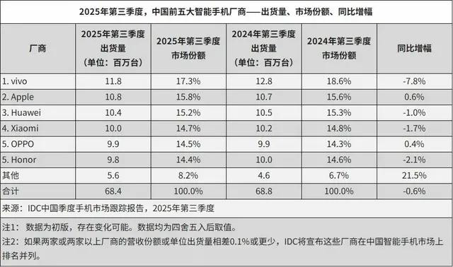 从整体市场基本面来看,2025年第三季度呈现“微降”态势。IDC数据显示,本季度中国智能手机出货量约6840万台,同比下降0.6%;Omdia统计的出货量为6720万台,同比降幅扩大至3%,机构普遍认为,传统销售淡季、新品发布数量偏少以及“国补”政策收紧,共同导致消费者换机决策更趋理性,市场需求持续承压。